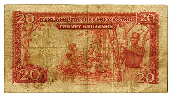 British West Africa. 1962, 20 Shillings, P-12 issued banknote, river scene with palm trees at front, harvesting scene at back, TDLR. Choice Fine.