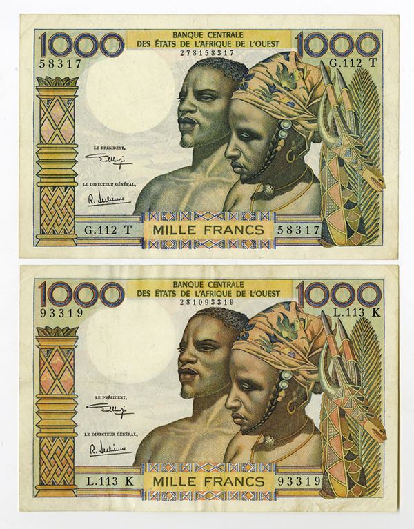 West African States, Lot of 2 notes, Includes Senegal. 1000 Francs. P-703Kk. Couple at middle-right end. Signature 9. Nice Very Fine; and Togo. 1000 Francs. P-803Tk. Couple at middle-right end. Signature 9. Very Fine or better, the small 2mm edge tear at bottom right margin. (2)