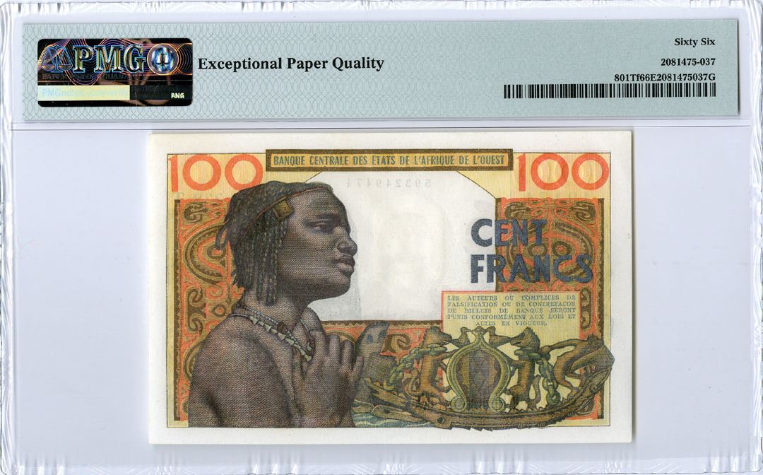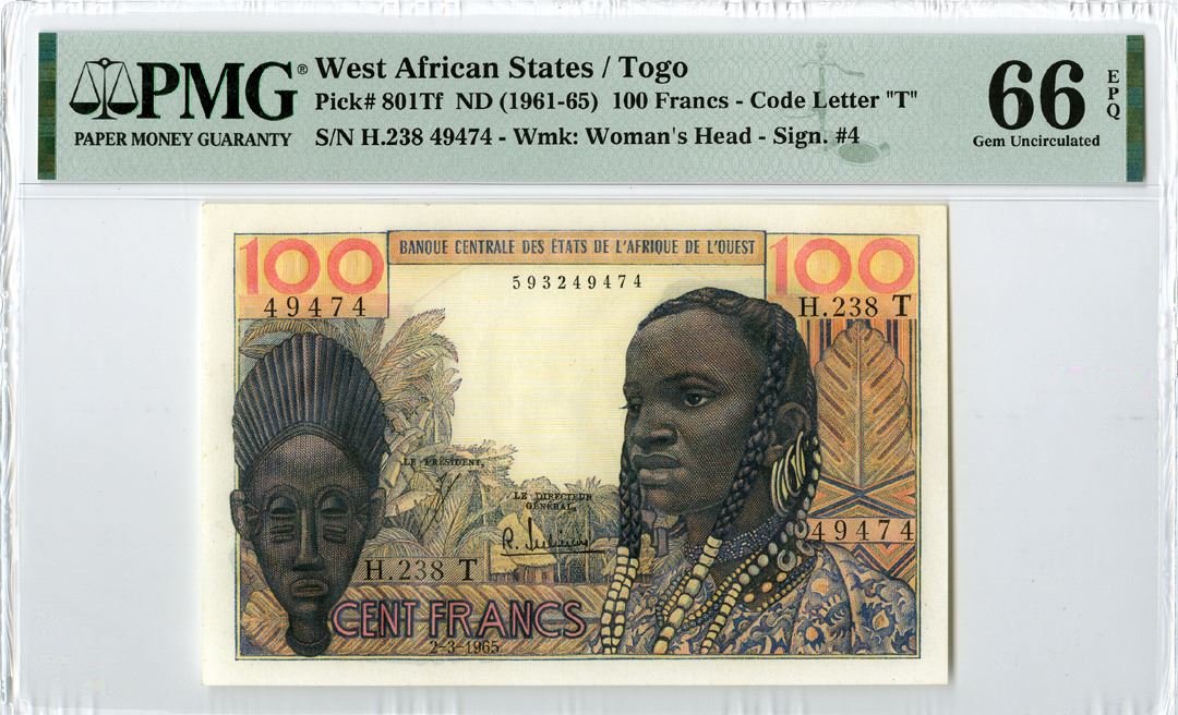West African States - Togo, ND (1961-65). 100 Francs, P-801Tf, Signature #4, Issued Banknote. Orange on m/c underprint with young woman at right and mask at left. S/N H.238.49474. PMG graded Gem Uncirculated 66 EPQ. Tied with 2 other notes as Highest graded out of 7 graded in the PMG census.