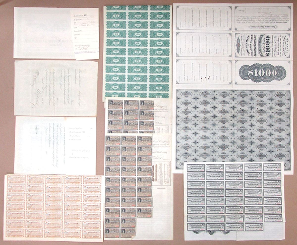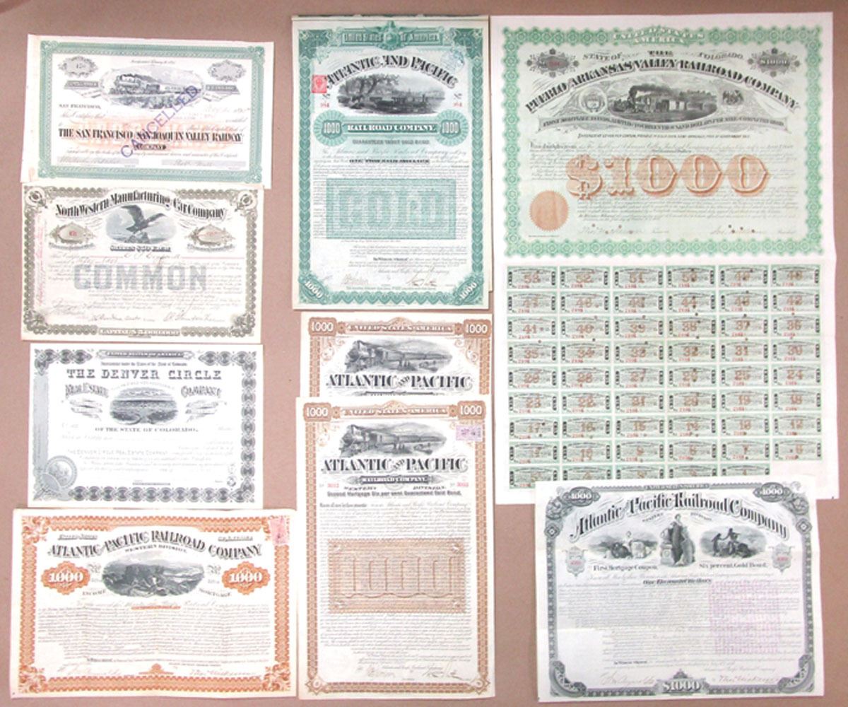 Various States. Lot of 9 Railroad Stocks and Bonds, Includes: San Francisco and San Joaquin Valley Railway, North Western Manufacturing and Car Co., Pueblo and Arkansas Valley Railroad Co., Atlantic and Pacific Railroad Co. and more. Certificates range from Fine to VF+ condition. (9). Sold "AS IS" no returns accepted.