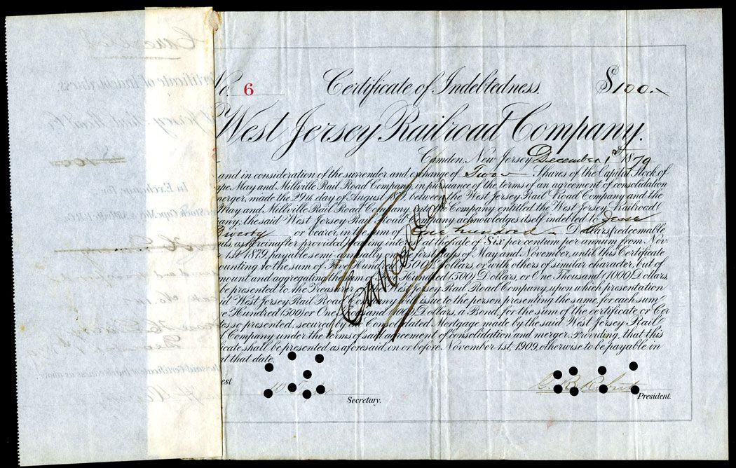 NJ, 1879, Certificate #6, $100.00., West Jersey Railroad Co., Issued and Cancelled Certificate of Indebtedness.VF