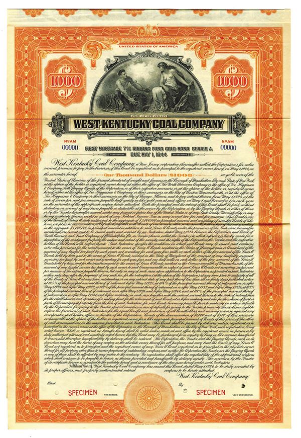 New Jersey. $1000 Specimen 7% Series A, 1st Mortgage Sinking Fund Gold Coupon Bond, Black print on large orange border and under tint, Image of two allegorical figures examining a bucket of coal at top, Specimen overprints, POC's, VF-XF condition. ABNC.