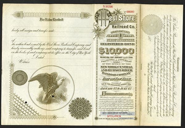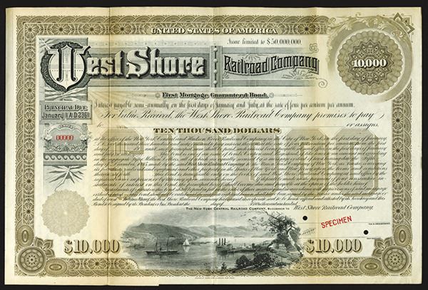 New York. $10000 Specimen 4% First Mortgage Guaranteed Bond. Black ink with ornate brown border and under print. Vignette of port and railway station at bottom center. Specimen overprint, POC's, VF with minor splitting along fold lines. ABNC.