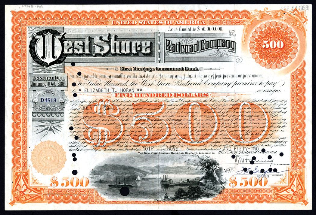 NY, 1952, $500.00 , West Shore Railroad Company Issued and PH. Cancelled Reg. Bond, VF