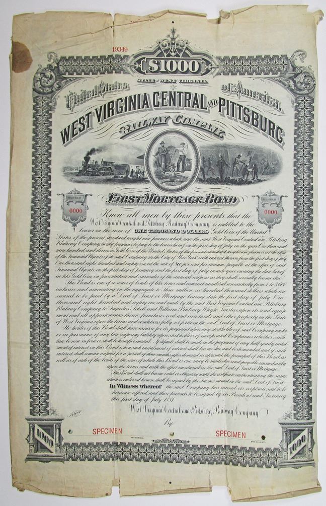 West Virginia, 1881. $1000 Specimen 6% First Mortgage Bond, Black text with gray border, no undertint, West Virginia state seal at center in oval frame, flanked by depictions of men at work. Red specimen overprints, 00000 serial numbers, POCs, Fine condition with damage and splitting to top margin, circular stain at top left, ABNC. This is one of 2 examples found in the ABN Archives in 2002 and the only one available.