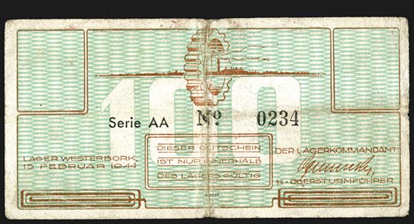 Netherlands. 1944 Westerbork WWII Camp voucher for 100 Cent. It was a transit camp in the Netherlands. Very Good, heavy center fold.