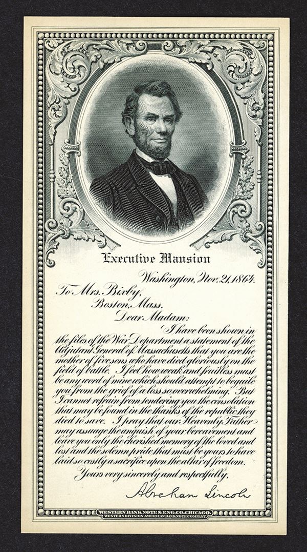 Chicago, Illinois, ND (ca.1900-1920), 3.25 by 6.25 inches, intaglio printed in black on card with ornate portrait of Abraham Lincoln at top with text of letter to a mother who lost 5 sons in the Civil War. Back has partially crossed out text offering this card to add to your "Lincoln" collection. In light pencil is written on the back "For E.B.McE - 2/15/(19)57. Scarce and attractive Lincoln advertising piece by WBNC.