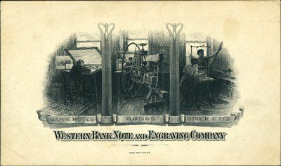 Chicago, IL. ca.1890-1900's. WBNC advertising trade card measuring 6 by 3.5 inches. Face of card has ornate engraving of the security printing process showing from left to right views of the engraving and printing process. Back has WBNC building and advertising information. Printed on thin card stock. Scarce advertising item from famous bank note company. Uncirculated. WBNC.