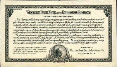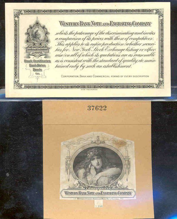 ca.1880-1920's. 3 different proofs. Two are similar and were evidently advertising pieces with text on one side and an engraving or vignette on the other side to advertisie the style and quality of work they did. Both have Native Americans on the face. Both are printed uniface on india paper. Both are in choice condition. The third item is an advertising heading or letter head with an allegorical woman with candles flanking both side of her portrait. The micro-imprint is "Western Division-American Bank Note Co." underneath the WBNC title and vignette. Evidently this item was prepared after ABNC took WBNC over. There are glue stains on the upper right. Scarce group of WBNC advertising proofs. WBNC, ABNC.