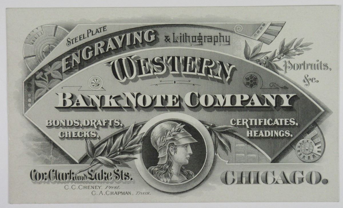 Chicago, Illinois. ND (ca.1870-90's) Business Card - Trade Card for Western Bank Note Co., 4.75 x 2.75 inches, printed in gray-black on off white thin card, Helmeted woman at bottom under ornate engraving of title, the card lists the different products the company prints, Ornate intaglio engraving. The company was located at the corner of Clark and Lake Streets. The back has 2 small areas of paper from previous mounting. Appears AU to Uncirculated on the face. Rare and attractive and first time offered by us. Western Bank Note Company was eventually acquired by American Bank Note Co.