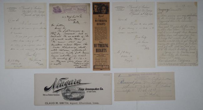 Illinois, California. Assortment of 7 Ephemera Items, ca. 1870-1950s, Including: Advertising bookmark (or thin strip of paper) for the Wuthering Heights book, as well as the 1939 Wuthering Heights film, starring Laurence Olivier; Niagara Fire Insurance Co. of New York Proof Advertisement header, with "Claud M. Smith, Agent, Cherokee, Iowa" underneath; National Tailoring Co. Receipt; Handwritten Letter on Order of Independent Rechabites Letterhead; Handwritten letter pair on Plymouth & Stonehouse Gas Light & Coke Co. Letterhead, both dated 1892 (2); Handwritten letter on lined paper with a 1955 date. All are in Fine-VF condition. Sold "AS IS" no returns accepted. (7)