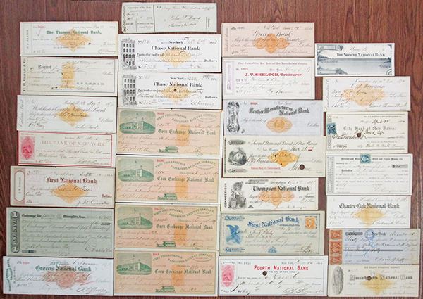 Various States, Lot of 28 pieces, highlights includes 20 different I.R. Checks including RN-G1, B, C, D & F varieties from Massachusetts, New York, Connecticut, and Pennsylvania. Also includes an 1865, San Francisco, CA., Silver Mining Company Assessment, an 1828 Chester County, Corporation of the Poor check, railroad related and banking checks and drafts and City Bank of New Haven; Charter Oak National Bank; Fourth National Bank of the City of New York; Thompson National Bank; New York and New Haven Railroad Co.; and Corn Exchange National Bank and others. Mostly I/C, some U/U with imprinted revenue. (28)