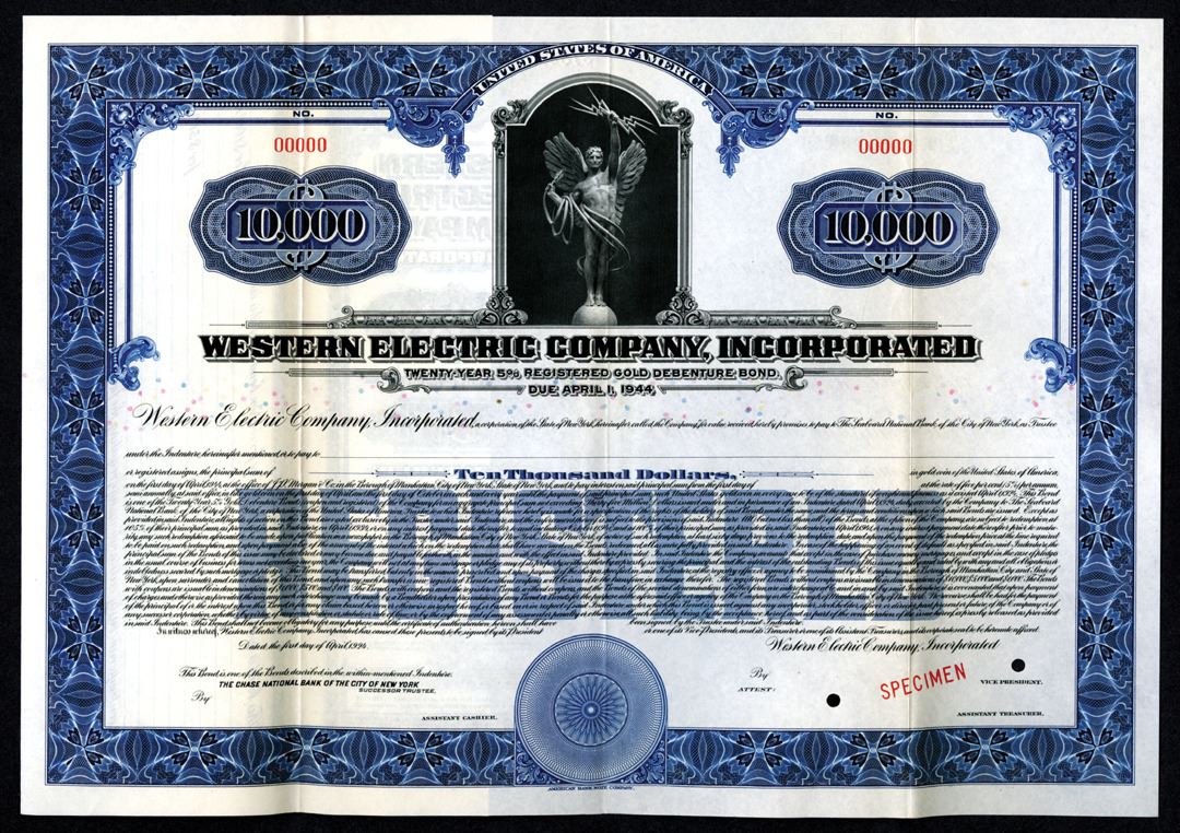 CA. Western Electric Co. Inc. 1924. Specimen Registered bond. $10,000 Registered Bond. Specimen. Bold "Golden Boy" vignette. ABNC. POCs. VF+