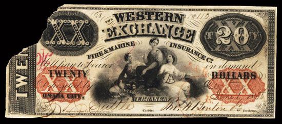 Omaha City, Nebraska Territory, 1856, $20, NE-80-Unlisted, Issued obsolete banknote or Certificate of Deposit, Black with red underprint, 3 allegorical women at center, S/N 110, note would have graded VF to VF+ but a 1 inch triangular piece is missing from the top left corner, rare denomination and note, DWC.
