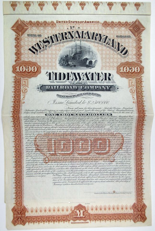 Maryland. $1000 Specimen 5% First Mortgage Gold Coupon Bond, Black text with red-brown border and undertint, Illustration of boats docked at a ship yard at top. No specimen overprints or serial numbers, POC's, VF-XF condition. Only known as a specimen in Cox.