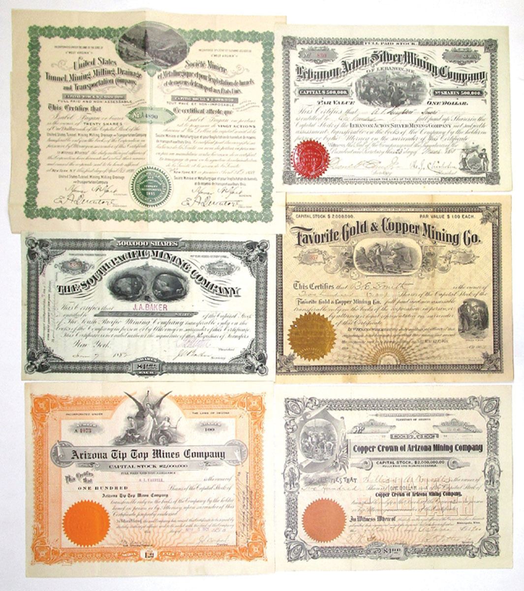 Various States, 1880 to 1921. Lot of 6 I/U Stock Certificates, Includes: 1880, Lebanon Acton Silver Mining Co.; 1882, South Pacific Mining Co.; 1899, United States Tunnel, Mining, Milling, Drainage and Transportation Co.; 1900, Copper Crown of Arizona Mining Co.; 1903, Favorite Gold & Copper Mining Co.; 1921, Arizona Tip Top Mines Co. Certificates range from VF to XF condition. (6). Sold "AS IS" no returns accepted.