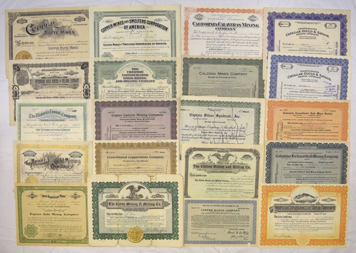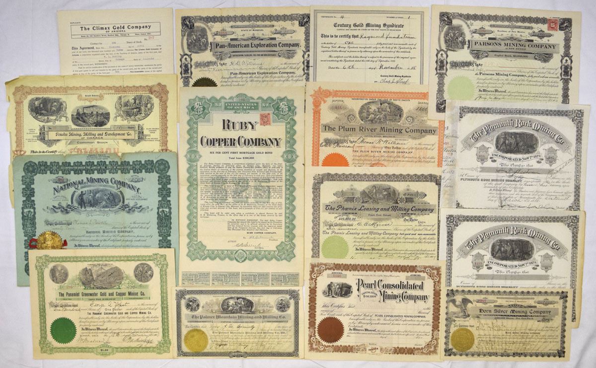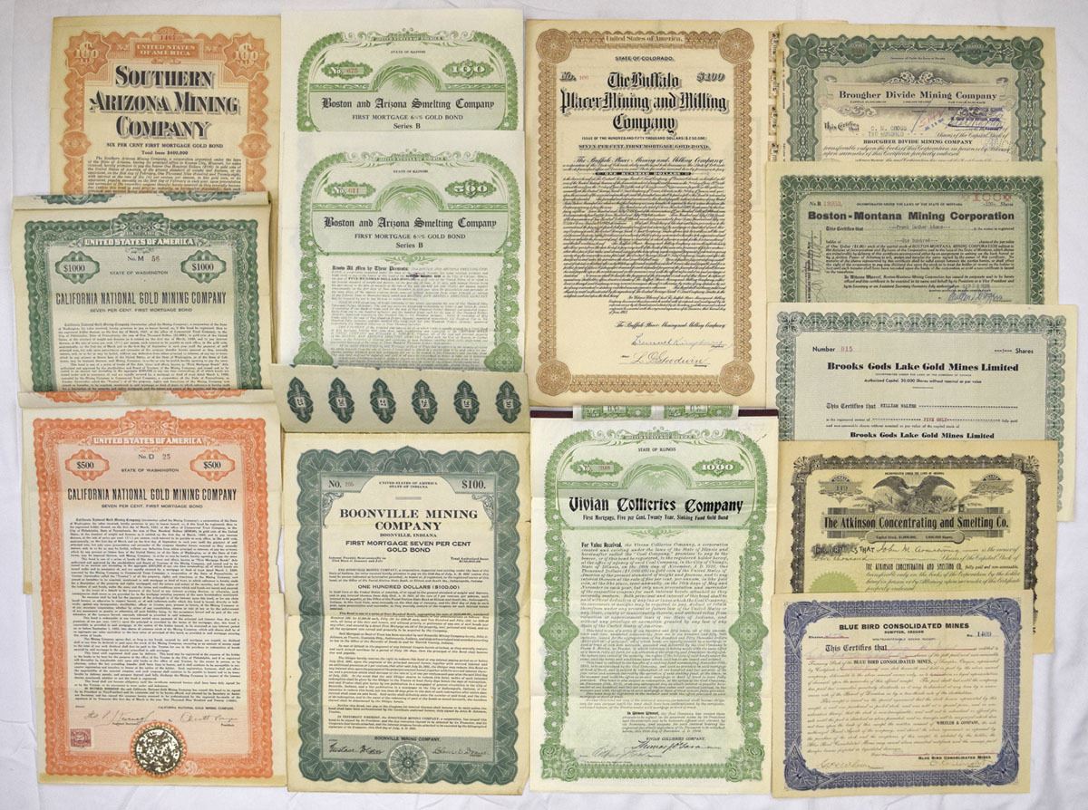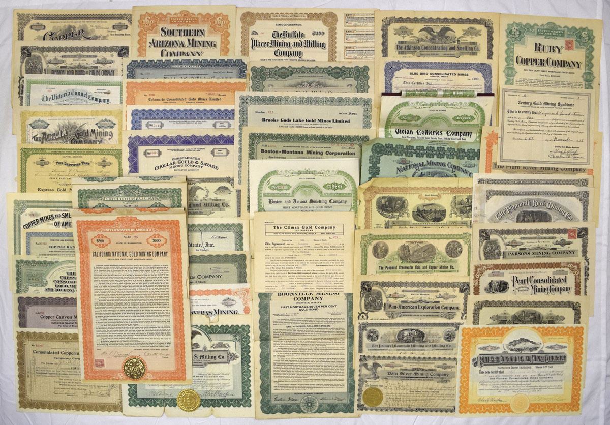 Various States...... Lot of 48 issued stock certificates and mining bonds representing gold, silver, copper, and smelting enterprises concentrated in the western states. Notable companies visible in the group include Copper Butte Mines; Copper Mines and Smelters Corporation of America; Chollar Gould & Savage Mining Co.; Ruby Copper Company; California National Gold Mining Co.; Boston and Arizona Smelting Co.; Southern Arizona Mining Co.; Brooks Gods Lake Gold Mines Ltd.; Blue Bird Consolidated Mines; Atkinson Concentrating and Smelting Co.; Parsons Mining Co.; and Pan-American Exploration Co., among others. The lot includes a mix of stock certificates, mortgage bonds, and debenture-style mining issues, many with ornate engraved vignettes depicting miners, smelters, machinery, allegorical figures, and western landscapes, along with decorative borders, serial numbers, handwritten signatures, and applied seals. Formats, paper types, and printing styles vary throughout. Conditions range from VG to XF overall, with typical folds, cancellations, edge wear, and handling consistent with age. (48). Sold “AS IS” no returns accepted.
