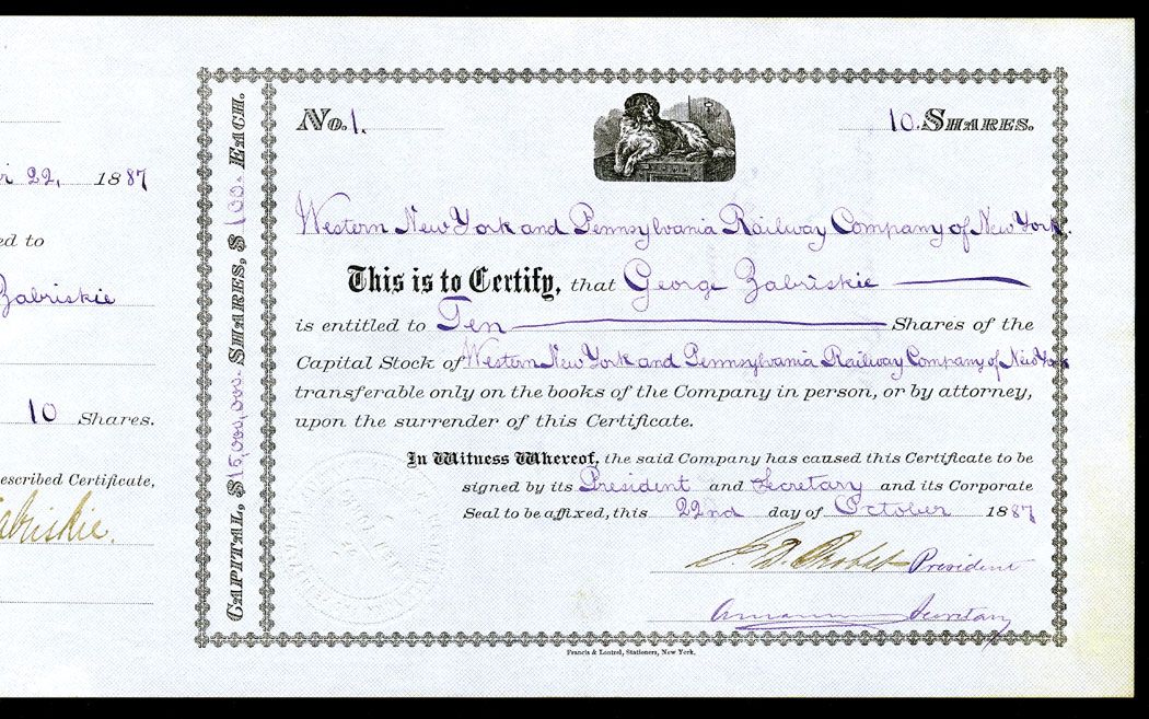 NY, 1887, Cert. # 1, 10 Shares, Western NY and Penn., Railway Co. of NY, Issued Stock Certificate, VF+.