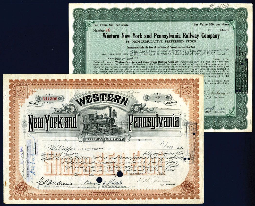 New York, Lot of 2 I/C stocks, both Western New York & Pennsylvania Railway Co. VF.