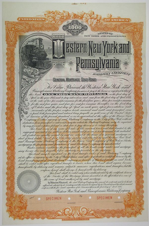 New York & Pennsylvania. 1895, 1000 Specimen 2% (for first 4 years, 3% for the next 4 years, and 4% thereafter) General Mortgage Gold Bond, Black text with orange border and undertint, #210 Train approaching within a circle frame to the left of company name. Red specimen overprints and POC's, VF condition with an extended margin at top, HLBN. Rare and only known as a specimen in Cox. The last of 2 examples available.