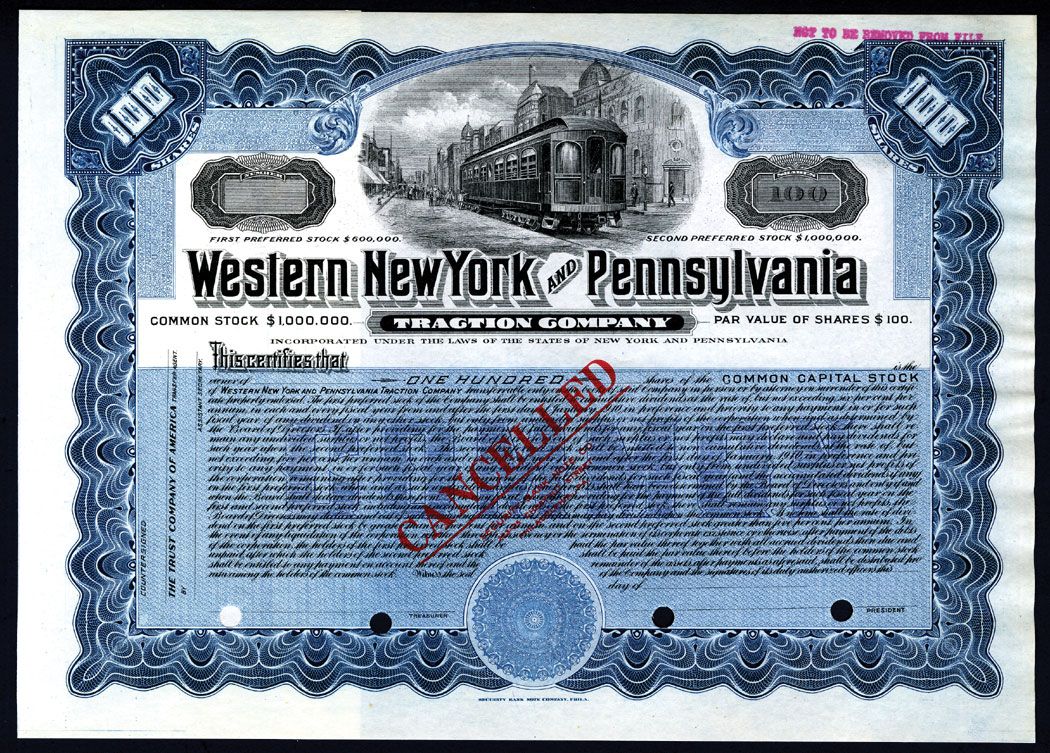 100 Shares, Specimen stock certificate. Red specimen "Cancelled - Security Bank Note Co." overprints and POC's. Blue border. Street car. XF condition. Unique in archive.