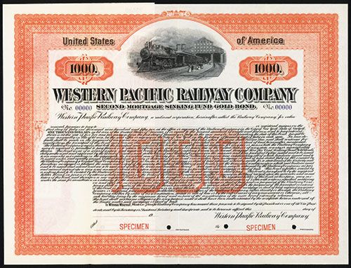 New York, 19xx, $1000, 2nd Mortgage 5% Sinking Fund Gold Specimen Bond, Locomotive leaving station r-l top center, POC's, VF condition, ABNC.