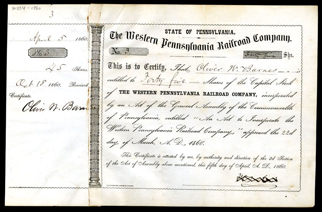 PA, 1860, Certificate #3, 45 Shares of Western Pennsylvania Railroad Co., Issued and Cancelled Stock Certificate.Vf