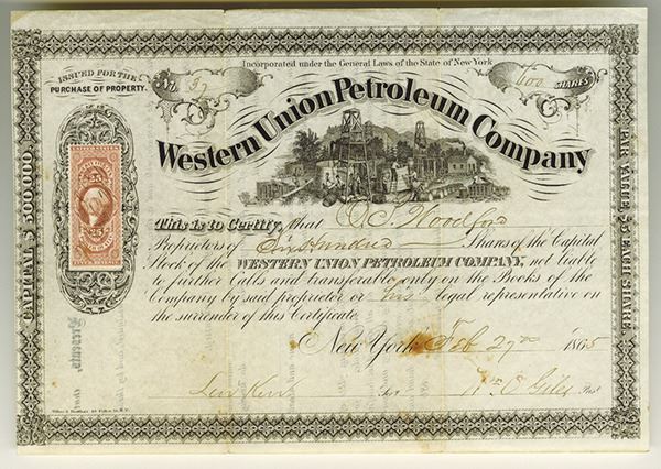 New York, 1865, 600 Shares, I/U, Oil wells and barrels under arched title, S/N 37, VF condition, toned by signature. Attractive and rare.