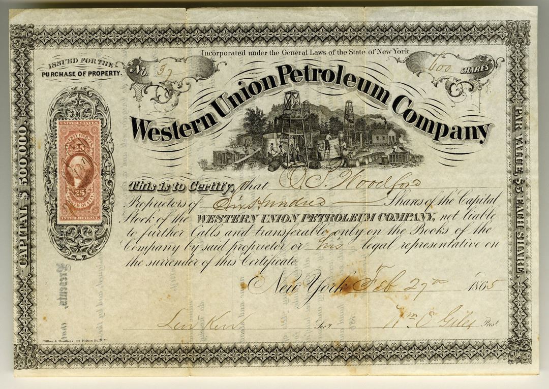 New York, 1865, 600 Shares, I/U, Oil wells and barrels under arched title, S/N 37, VF condition, toned by signature. Attractive and rare.