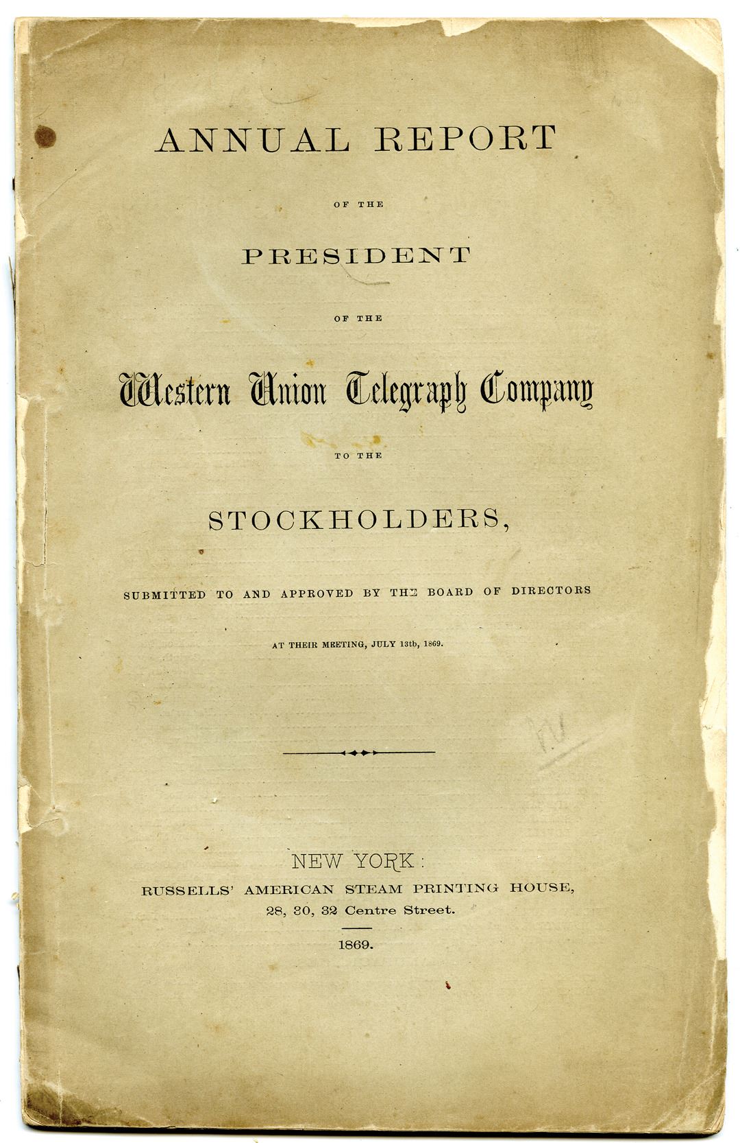 New York..., 1869. Annual Report of the President of the Western Union Telegraph Co. to the Stockholders. Black text and many pages long, includes important company information, such as details of the reconstruction of telegraph lines; disbursement of net profits; and extent of rival organizations. Western Union regards its founding year as 1851, and bought smaller companies thereafter rapidly. By 1860 its lines reached from the East Coast to the Mississippi River, and from the Great Lakes to the Ohio River. In 1861 Western Union opened the first transcontinental telegraph. In 1865 it formed the Russian-American Telegraph in an attempt to link America to Europe, via Alaska, into Siberia, to Moscow - a project abandoned in 1867 following the successful laying of a transatlantic cable in 1866. Western Union introduced the first stock ticker in 1866, and a standardized time service in 1870. The next year, 1871, the company introduced its money transfer service, based on its extensive telegraph network. In 1879, Western Union left the telephone business, settling a patent lawsuit with Bell Telephone Company. As the telephone replaced the telegraph, money transfer became its primary business. (From the Collection of John E. Herzog)