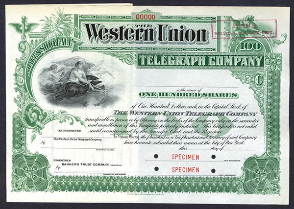 New York, NY. 19xx (ca.1900), 100 Shares, Capital Stock, Specimen, Black with green undertint, allegorical women and angels on left under ornate title, Specimen overprints, POC's. Rare Western Union certificate design. XF. ABNC.