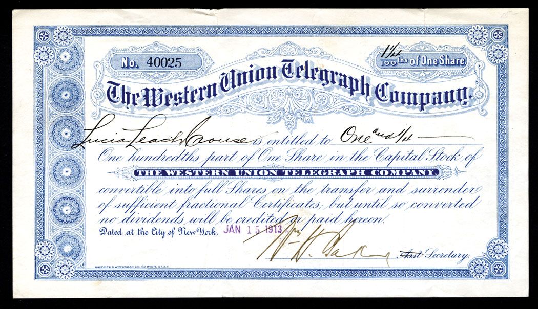New York, 1 1/4/100ths of 1 Share. I/U. Blue border and text in ornate design, no vignette, VF.