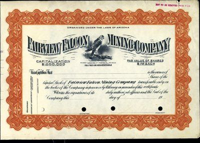 19--, ca.1900's-20's. Odd Shares. Specimen stock certificate. Purple "Not to be Removed From File" and POC's. Vignette of falcon. "Mines Located at Westgate, Nevada". Choice uncirculated condition. Unique in archive. SBNC.
