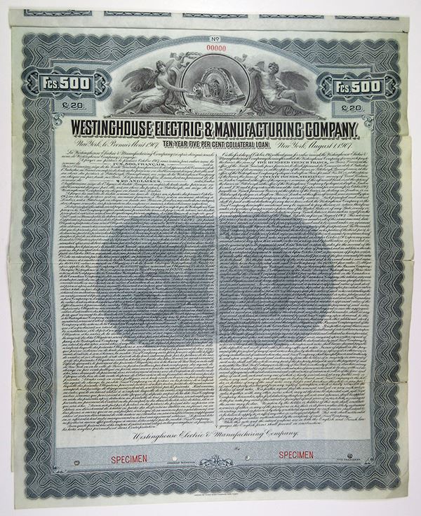 Pennsylvania. 1907 Specimen Bond. 500 French Francs Collateral 5% Coupon Bond, Black text with blue border and undertint, Allegorical figures flanking generator. Red specimen overprints, POC's and "00000" serial number, VF condition. ABNC.