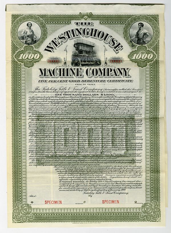 Pennsylvania. $1000 Specimen 5% Debenture Certificate Gold Coupon Bond, Black print on olive green border and under tint, Vignette of a steam engine at top with flanking male figures, Specimen overprints and POC's, VF-XF condition, ABNC. Organized in 1881, the Westinghouse Machine Company was devoted primarily to the manufacture of gas and steam engines, turbines and mechanical stokers. The main works were located at East Pittsburgh at a property covering nearly 50 acres. With a working floor space of 20.4 acres, the company employed approximately 3,500 men by 1905. Some of the company's most notable products were the Westinghouse-Parsons steam turbines in various sizes, the Westinghouse-Corliss steam engines, the Westinghouse gas engines, Marine type steam engines and high speed single-acting steam engines. Rare bond with only 3 found in the ABN Archives in 2002