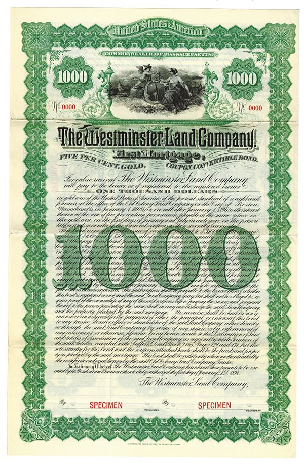 Massachusetts. $1000 Specimen 5% 1st Mortgage Gold Convertible Coupon Bond, Black print on green border and under tint, Allegorical figures at top, Specimen overprints and POC's, Fine condition with splitting along fold lines, ABNC.