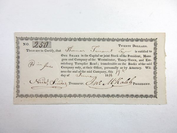 Maryland. 1 Share Capital or Joint-Stock of the Presidents, Managers and Company of the Westminster, Taney-Town, and Emmitsburg Turnpike Road, Black print on small sized certificate, XF condition.