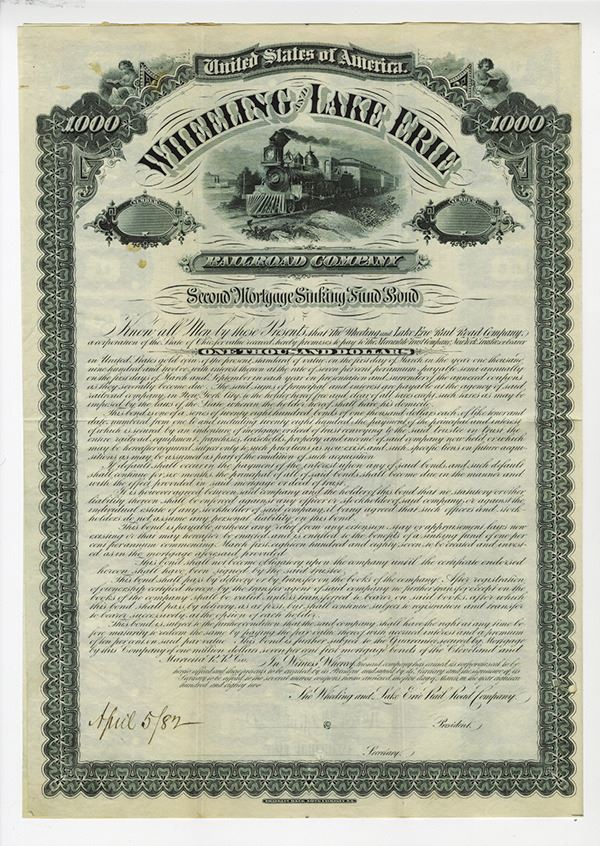 Ohio, $1000 2nd Mortgage Sinking Fund 7% Coupon Bond, Specimen, Black printing without under print, Locomotive passing steamboat in background, ornate border with cherubs at top left and right, POC's, Dated "April 5/(18)82, "Return to Issue Room" overprinted in purple on back, No specimen overprints, VF condition with a small 4mm stain in the upper left area, attractive bond. Listed railroad, but unlisted as a bond, only as a stock certificate. Unique in archives. This is the only example we have ever seen and the only one available.