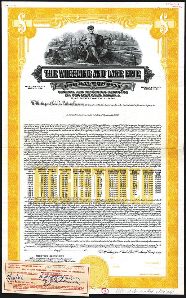OH. 1946. $-odd. Registered 2 3/4% Bond, Ser.A Bond. Yellow border and undertint. Allegorical seated man surrounded by a number of different trains. Unlisted bond variety and earlier listed date. SBNC. Unique in archive.