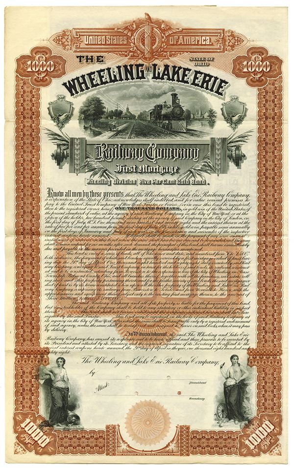 Ohio. Specimen $1000 1st Mortgage 5% Gold Coupon Bond, Black on red-brown border and underprint, Locomotive passing child under title, allegorical women at bottom, POC's, No Specimen overprint, back with red "Return to Record and Specimen Room", VF condition, Listed railroad in Cox, but unlisted bond variety, design and color. This was the only example found in the archives. Unique. FBN