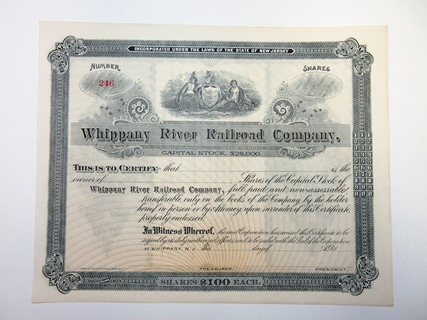 New Jersey. Odd Shares Capital Stock Certificate, Black print on black border with orange under tint, Seal of New jersey at top, Serial number 246, VF-XF condition, Albert B. King & Co.