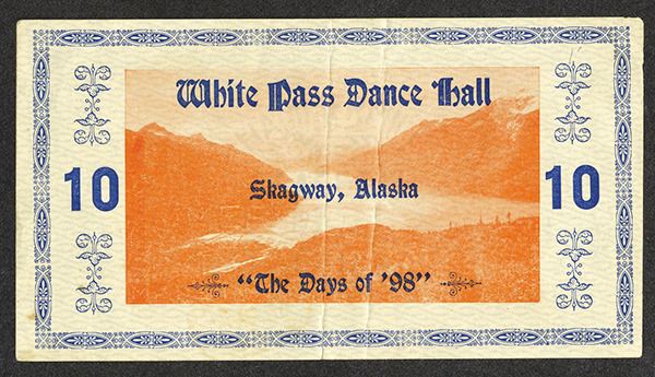 Skagway, Alaska. (ca.1900-1910). $10 scrip note. Back has photo vignette of men hanging out at bar. VG to fine condition with tape reinforcement on top vertical middle where note has separated. Rare early Alaska banknote and scrip item.