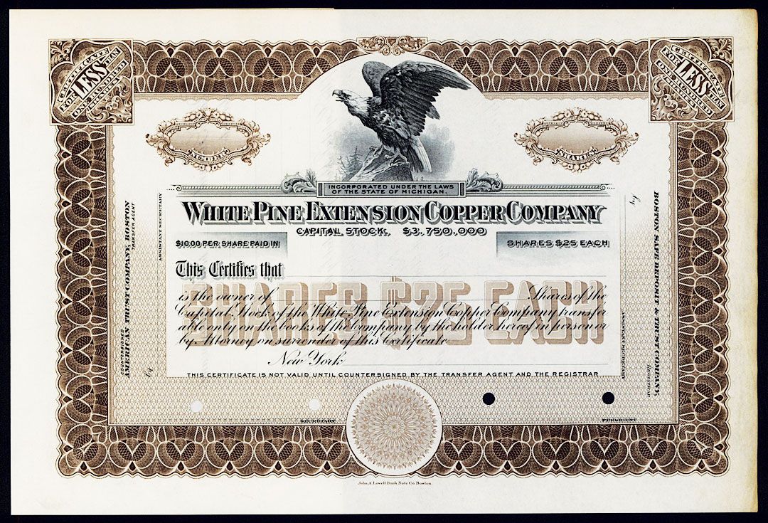 Michigan, ND (ca.1900-1910), Less Than 100 Shares, Specimen, Black with brown border and underprint, Eagle vignette with ornate title in middle, Capital stock $3,750,000. POC's, AU condition with light toning on right margin. Rare Michigan mining stock certificate and possibly unique as specimen. JAL BNC.