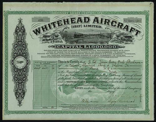 Britain, 19(17). 7% participating preference shares (90). Green border with black text, biplanes flanking airport or air force base, underprint of large biplane in middle in light green, slight toning at edges o/w VF, signature of Whitehead as Director.
