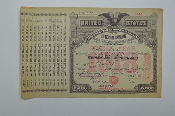 PA. Large Format 1918 tax stamp for Wholesale Liquor Dealer. $100. For a Chestnut St. store in Philadelphia. Fragile and toned. Fine.