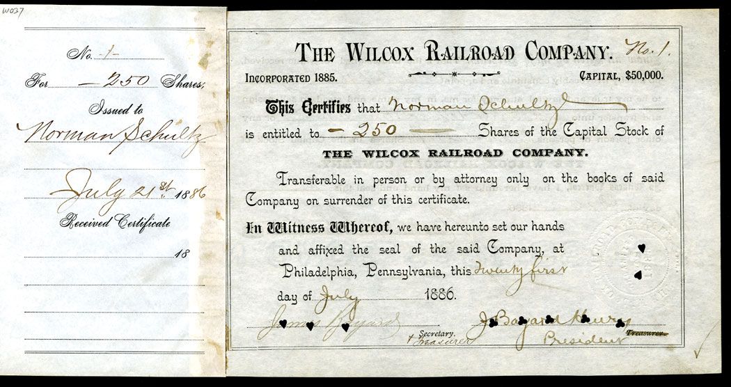 PA., 1886, Certificate # 1, 250 Shares of Wilcox Railroad Co., Issued and Cancelled Stock Certificate.