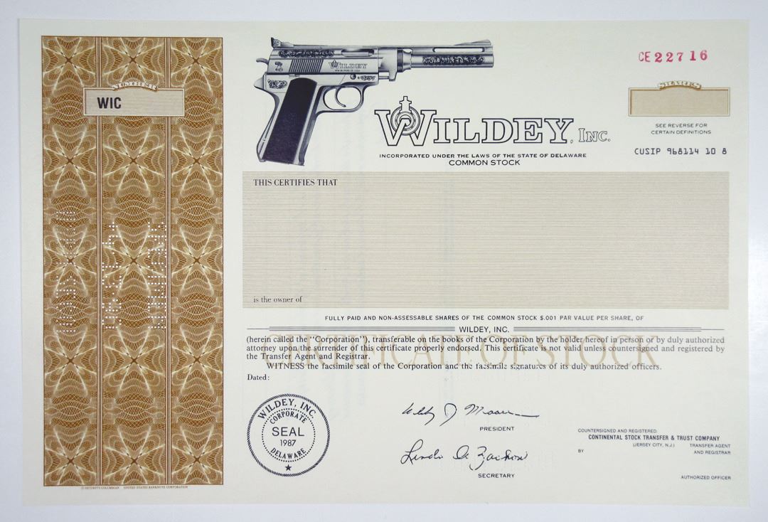 Delaware, 1990. Odd Shares Specimen Stock Certificate, Black text with brown border at left and underprint, Wildey gun depicted at top center. Specimen POCs, VF condition, SC-USBN. The Wildey is a gas-operated, double-action/single-action pistol designed by Wildey J. Moore.