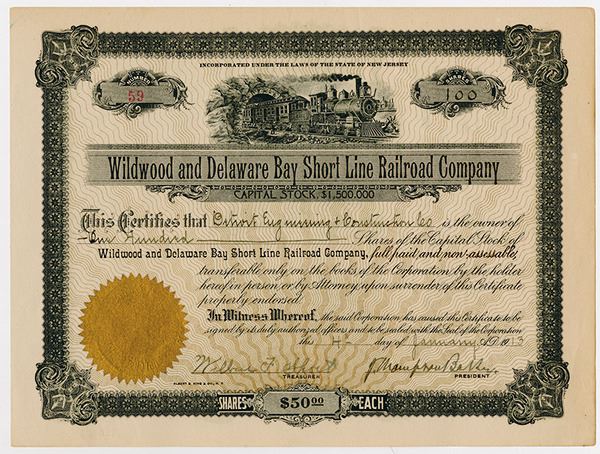 New Jersey. 100 Shares Capital Stock Issued and Uncancelled Certificate, Black print on black border with golden under tint, Locomotive exiting tunnel at top, Low serial number-#59, VF-XF condition, Albert B. King & Co.