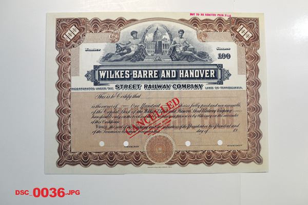 Pennsylvania. 100 Shares Capital Stock Specimen Certificate, Black print on brown border and under tint, Image of allegorical male figures flanking company title at top, Cancelled overprint and POC's, VF-XF condition, SBNC.
