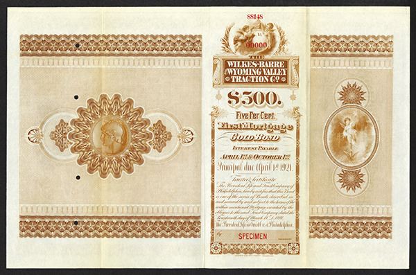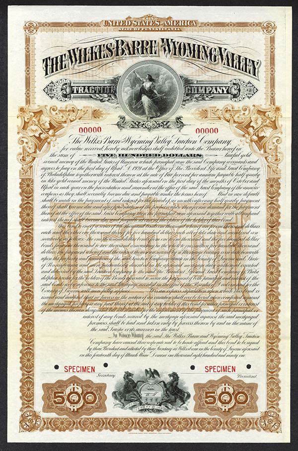 Pennsylvania. 1891. Specimen bond. $500. 5% Gold Bond. Brown border and undertint. Allegorical woman holding lightening bolts on top and PA Arms on bottom. No coupons attached. Red specimen overprint, "00000" serial numbers and POC's. XF condition. Unlisted railroad in Cox. Rare and attractive bond. ABNC.